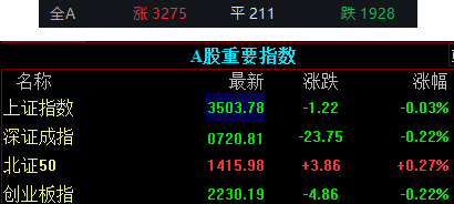 7月16日,三大股指集体收跌,上证指数报收3503.78点,跌0.03%;深成指报收10720.81点,跌0.22%;创业板指报收2230.19点,跌0.22%。沪深两市全天成交额1.44万亿,较上个交易日缩量1700亿。全市场超3200只个股上涨,近2000只个股下跌。
